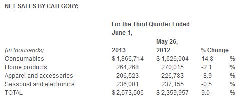 Taking a closer look at the numbers, we can see that the quarter was not as strong as it appeared on the surface. Same-store sales increased 2.9% year-over-year, equal to the performance in the second quarter, but down significantly from the 6.6% rate we saw in the first quarter. Growth at Family Dollar stores is clearly slowing, but more importantly, the composition of the sales growth is moving in an unfavorable direction as it relates to the firm’s profitability. Revenue at Family Dollar’s ‘Consumables’ category advanced 14.8% year-over-year during the quarter, but this category includes low-margin items such as cigarettes, beauty, and food. Smaller (but higher-margin) categories such as ‘Home products’ and ‘Apparel and accessories’ experienced sales declines.
