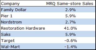 The above image (of most-recent-quarter same-store sales) reveals that consumers are shopping increasingly more at Pier 1 (click ticker for report: ) and Restoration Hardware (RH) than at Target (click ticker for report: ) and Wal-Mart (click ticker for report: ). Despite wage stagnation and the expiration of the payroll tax cuts, consumers still appear to be interested in purchasing more expensive items, leading sales of discretionary items at discounters to plunge.