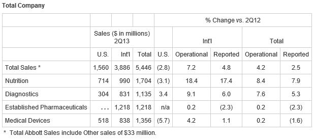 On Wednesday, global healthcare company Abbott Labs (click ticker for report: ) issued decent second quarter results that revealed the strength of the firm’s international portfolio. Excluding changes in foreign exchange rates, worldwide sales advanced 4.2% thanks primarily to expansion in its international ‘Nutrition’ segment, which advanced over 18% on an operational basis (excluding currency) during the period. Growth in emerging markets, which now represent more than 40% of Abbott’s total sales, was impressive, jumping more than 13% from the same period a year ago. Second-quarter adjusted gross margins of 55% and adjusted diluted earnings per share of $0.46 both came in ahead of internal projections. Year-over-year comparisons were difficult given the spin-off of AbbVie (click ticker for report: ) at the beginning of the year. Abbott rolled out 24 new products in its ‘Nutrition’ segment during the period and launched the first HCV genotyping test as well as Tecnis. Overall, we thought the quarterly performance was decent, though the Abbott story very much remains an international (non-US) one.