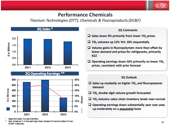 Management noted several options, including a full or partial spin-off or sale, though it gave no indication of which route it preferred. We’re sure management will take into consideration how the move impacts shareholder value, but from what CEO Ellen Kullman said on the conference call, we believe the firm will likely have little or no interest in the ‘Performance Chemicals’ business going forward, as it now sees the business as commoditized. Kullman explained why the segment had to go, saying: