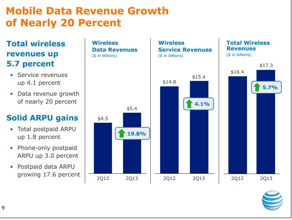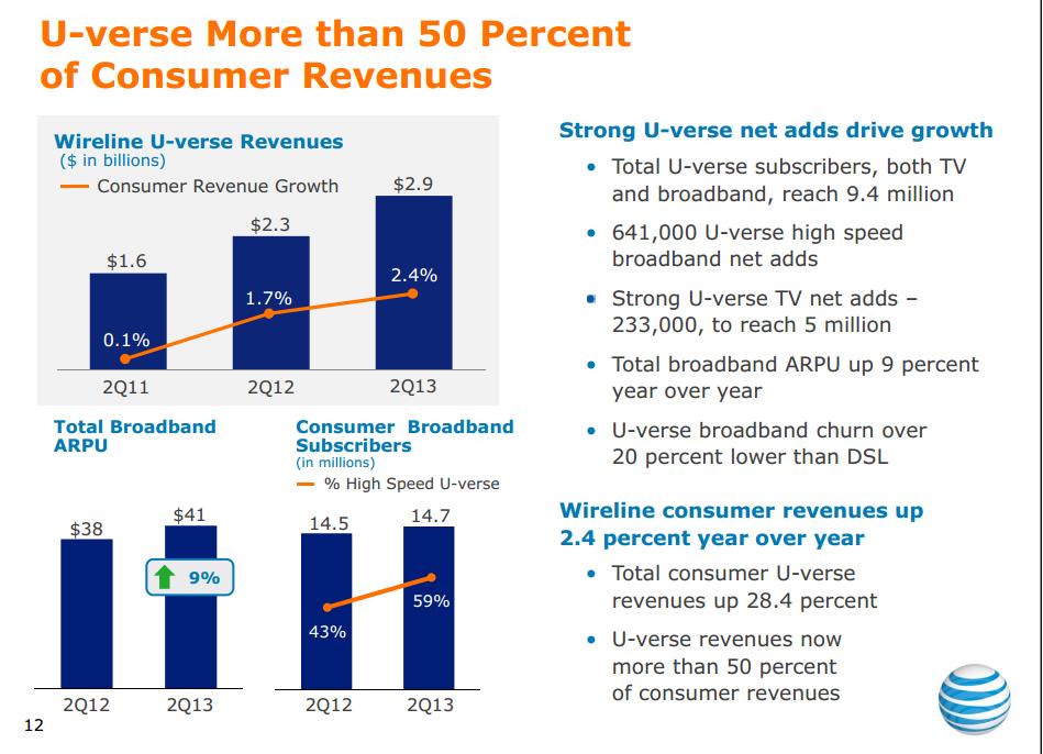 AT&Ts growth on the wireline side of the business continues to be slightly less exciting, but we are seeing solid broadband internet ARPU growth (up 9% year-over-year) and strong U-verse growth (up 28.4% year-over-year). As speed becomes more relevant to consumers, we anticipate high-speed U-verse revenue will continue to grow at a strong clip.