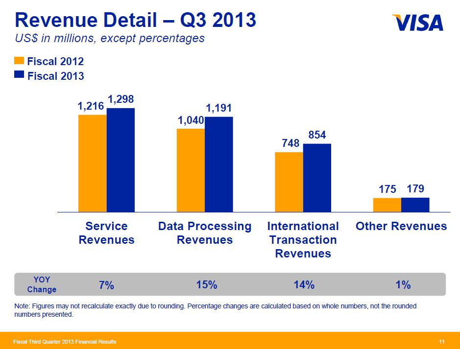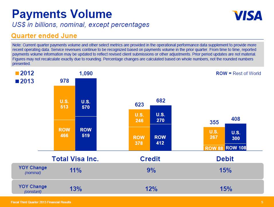 Visa continues to ride the secular trend in credit payments to strong payment volume growth. Total payments processed increased 11% year-over-year to $1.09 trillion, driven by strong credit payment volume growth of 9% and debit volume payment growth of 15%. The infamous Durbin Amendment began in April 2012, so Visa faced relatively easy comparisons with respect to US debit payment volumes (debit volume was down 54% year-over-year in the third quarter of fiscal year 2012). Still, we think the company has found its bottom in debit processing, and we should see continued growth going forward.