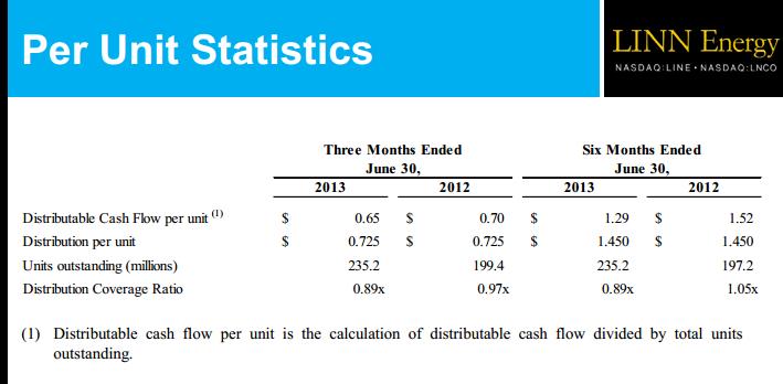 Highly controversial oil producer Linn Energy (click ticker for report: ) announced mediocre second quarter results Thursday morning. Distributable cash flow (DCF) per unit declined 7% year-over-year to $0.65, even though net income rose 24% year-over-year to $1.47 per unit.