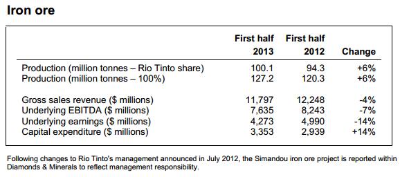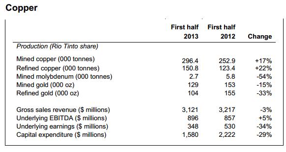 Best Ideas Newsletter portfolio holding Rio Tinto (click ticker for report: ) announced weak, but better-than-expected, financial performance for the first half of 2013 Thursday. Earnings per share declined 71% year-over-year to $0.93, though revenue declined only 3% year-over-year to $24.5 billion as production increases were able to partially offset commodity price weakness. Underlying earnings per share, which is adjusted for one-time charges, exchange rates, and write-downs, declined just 18% year-over-year to $2.29.