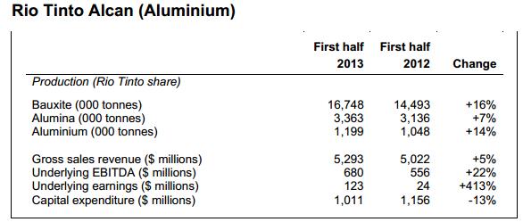 Alcan performed materially better than it did during the prior-year period, with underlying earnings up over 400% to $123 million and production increases in bauxite, alumina, and aluminum. This increase in profitability came in spite of an 8% drag from declining market prices. Rio received post-tax cost-savings of $95 million and had increased production at its Alma smelter.