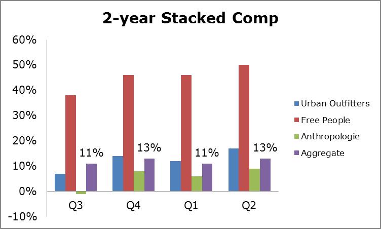 Anthropologie is also experiencing positive growth, as we can see the two-year stacked comp has been positive in the past three quarters. Not long ago, it seemed the brand had lost a bit of its luster, but we think the improving housing market is lifting the brand’s fortunes, especially since many of its products appeal to young home buyers.