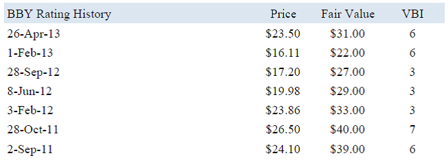 Still, we believe the fundamental improvement in Best Buy’s business is largely reflected in its share price. Though we have long held the belief that shares of Best Buy were undervalued (see our rating history below), we’re sticking with our fair value of $31 per share for the time being. As such, we won’t be adding the retailer to the portfolio of our Best Ideas Newsletter at current levels (about $34 per share).