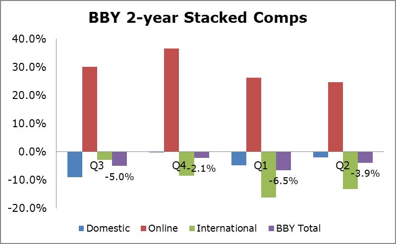 In our view, the most encouraging news in the quarter was the firm’s domestic same-store sales, which were down just 0.4% year-over-year. In fact, we can see from the above chart that the two-year trend at the important domestic store base is improving, while online sales continue to grow at a solid rate. As a result of online purchases being taxed in more areas, the price difference between Best Buy and competitor Amazon (click ticker for report: ) has narrowed.