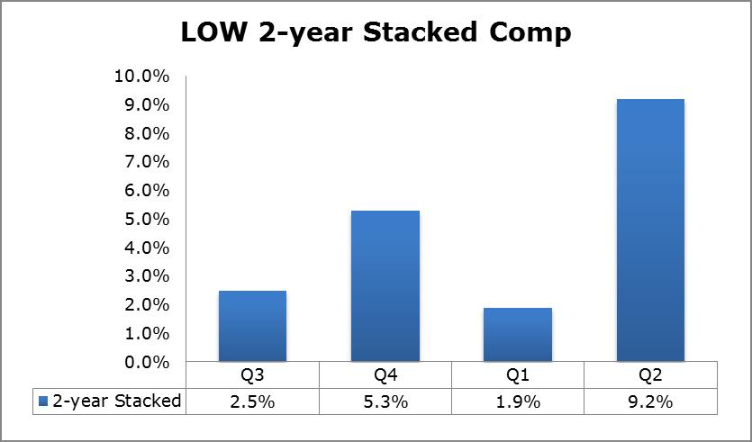 Without question, Lowe’s second-quarter performance bucks the recent trend of modest growth. Same-store sales jumped 9.6% during the second quarter compared to a decline of 0.7% during the first quarter. Management proclaimed that much of the strength was due to internal improvement, but we believe Lowe’s was simply a beneficiary of the strengthening housing market. The 2-year stacked comp trends from Home Depot and Lowe’s suggest Lowe’s is losing market share to its larger rival.