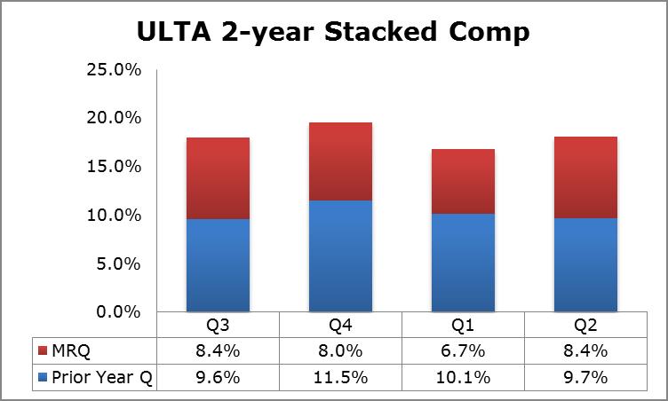 After same-store sales advanced “just” 6.7% year-over-year during the first quarter, growth reaccelerated at Ulta despite an increased number of locations (and risk of cannibalization). Same-store sales soared 8.4% year-over-year during the second quarter on top of a 9.7% sales gain during the same period last year. Management noted that Ulta gained market share during the second quarter and was confident it will continue to win share with the combination of robust comp sales growth and new stores.