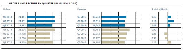 Fitch recently downgraded Siemens’ debt due to “insufficient progress” with respect to restructuring savings, but the firm’s ‘A’ rating is solid and investment grade, and we certainly have no qualms with the pace of order expansion and book-to-bill numbers thus far at the firm through 2013 (first image below). The German conglomerate’s recent ROCE (return on capital employed) and free cash flow marks are also strong (second image below).
