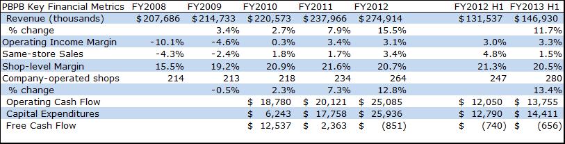 For a self-declared, “fast-growing” company, Potbelly’s growth track record over the past several years is uneven. Revenue growth was relatively lackluster from 2008-2011, but the company accelerated store openings in 2012 to achieve revenue growth of 15.5%. Performance has been consistent in 2013, with revenues for the first half of the year up 11.7% compared to the first half of 2012.
