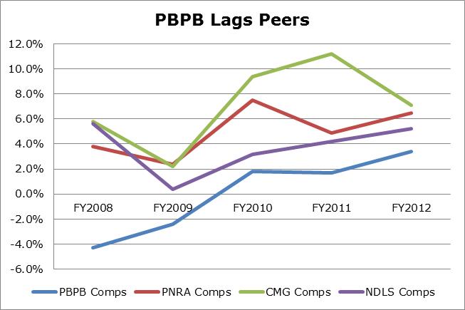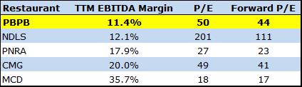Comparing Potbelly’s valuation to its peers reveals an interesting situation. Even though the firm sports an inferior EBITDA margin compared to its peers, both its trailing and forward P/E are much higher than those of peers. For perspective, Potbelly’s P/E exceeds that of Chipotle—a restaurant known as one of the best operators in the fast casual space. Even more perplexing, EBITDA grew just 7.6% year-over-year in fiscal year 2012, while Chipotle’s EBITDA surged 21% year-over-year off of a substantially larger base.