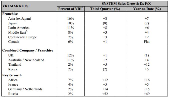 In spite of struggles domestically and in China, Yum! Brands performed relatively well across many of its key international markets including Russia (up 52% year-over-year), Africa (up 12% year-over-year), and Latin America (up 8% year-over-year). 215 new units opened internationally during the third quarter, with 90% opened by franchisees. The segment has overtaken the US in terms of operating profit contribution.