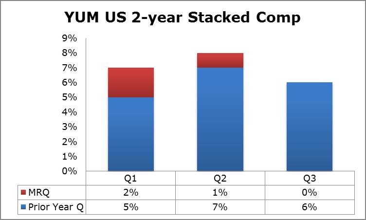 Though we admit the situation in China should be the primary focus for investors, Yum! Brands’ domestic business isn’t performing so well either. After solid comparable sales growth through the course of 2012, Yum! Brands’ US comp sales have slowed sequentially in the first three quarters of 2013. In fact, only Taco Bell remained positive during the third quarter as comparable stores sales increased 2% year-over-year.