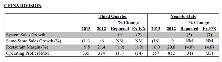 Store productivity in China remains poor following terrible press from China Central TV regarding cleanliness in August, as well as news about a poultry scandal at the beginning of calendar 2013. Comparable store sales declined 11% year-over-year in China during the third quarter, with comps at KFC falling 14% and comps at Pizza Hut increasing 5% in the country. Same-store sales in China declined 11% (KFC: -13%; Pizza Hut: +6%) year-over-year in September, so there is no evidence that conditions are improving at this time.
