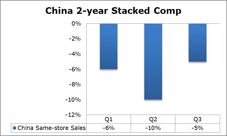 Yum! Brands lowered its full-year earnings per share guidance to a year-over-year decline of high-single to low-double-digit expansion thanks to persistent weakness in China and a belief that same-store sales growth will not be positive in the fourth quarter. Management previously forecasted earnings per share to decline in the mid-single-digits. However, Novak noted that the firm can achieve earnings per share growth of at least 20% in 2014, though we note that is predicated on substantial improvements in China.