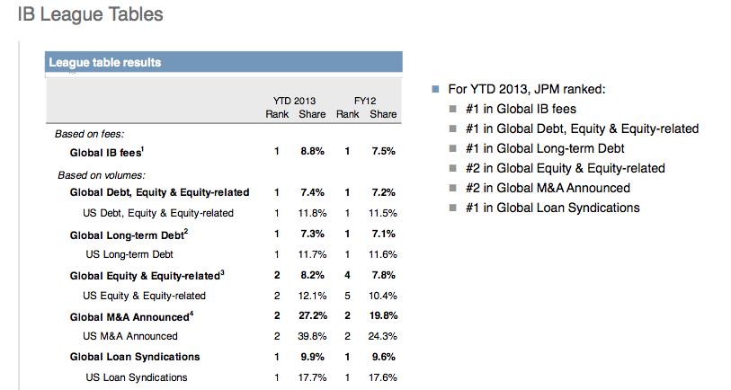 On the positive side, JP Morgan is gaining global investment banking market share. The company is ranked first globally in investment banking fees with approximately 8.8% of the market.