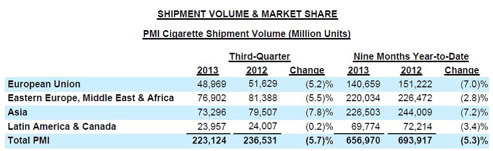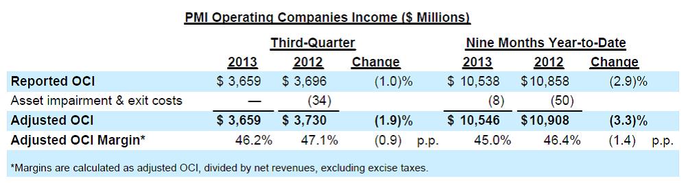 On Thursday, Philip Morris International (PM) reported third-quarter results that showed the continuation of a very challenging cigarette volume environment. Reported net revenues held the line thanks to significant pricing strength, but adjusted ‘operating companies income’ (OCI) still fell 1.9% (shown below). We’re growing skeptical of the firm’s ability to control costs, as there should have been better performance on the operating line given that pricing completely replaced volume losses in the period (price falls straight to the bottom line). Profit margin improvement was surprisingly absent, with the company’s adjusted OCI margin falling 0.9 percentage points from the year-ago period.