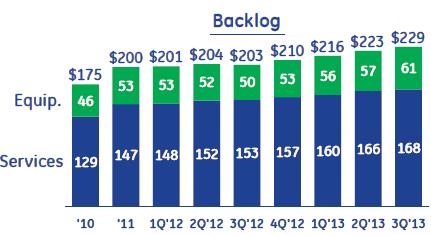Needless to say, the global business environment improved significantly during the third quarter, and we’re not sure the threat of a US government shutdown (and by extension, the shutdown itself) did much to impede the business of global industrial conglomerates. GE’s backlog of equipment and services at the end of the quarter was its highest ever at $229 billion (up $6 billion sequentially), resulting in a book-to-bill ratio of 1.2 (a number above 1 is solid). We pay more attention to the pace of the firm’s orders and book-to-bill ratio (as an indication of future performance) than we do its already-reported (past) results.