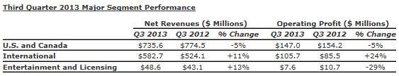 Sales in Europe, Latin America and Asia Pacific advanced in the period, and emerging market growth registered 22% in the quarter. The ‘International’ segment recorded impressive 24% operating profit growth! The ‘Entertainment and Licensing’ segment’s operating profit dipped in the quarter, but this was as a result of the addition of Backflip Studios to the segment (its contribution to operating profit is much smaller than the other two segments, as shown above). Overall, operating-profit performance wasn’t bad.