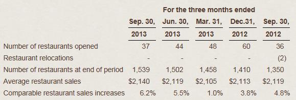 On the other hand, Chipotle continues to defy all odds. The company’s third-quarter report, released last Thursday, revealed accelerated comparable restaurant sales growth of 6.2% thanks to increased traffic (see image below), which helped drive revenue 18% higher from the same period a year ago. Though restaurant level operating margins faced some pressure in the period, net income still leapt more than 15%. Diluted earnings per share came in at $2.66 for the quarter, an increase of 17.2%. The firm’s outlook was no less impressive. The firm’s fourth-quarter comp is now expected to be similar or slightly better than the third-quarter mark. For 2014, management plans to open more restaurants than it did in 2013 (180-195 versus 165-180) and anticipates potential upside in its full-year guidance calling for ‘low-single-digit’ comp increases (should menu price initiatives be pursued). We love when restaurants talk about price increases – nothing improves margins (or mitigates cost pressure) and bolsters earnings better than hiking menu prices.