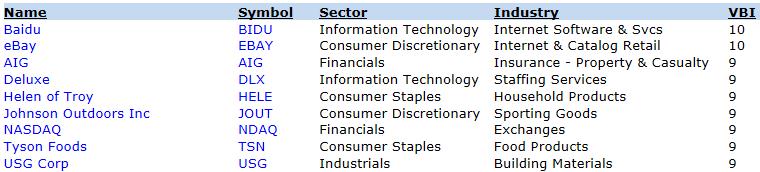 The Valuentum Buying Index ratings across our coverage universe can be found here (a link that is permanently established on the left column of the website’s home page), and pasted below is a snapshot of the top rung of the current VBI distribution. Baidu (BIDU) has recently performed wonderfully, eBay (EBAY) has roughly doubled since it first registered a VBI of 10, AIG (AIG) has performed well, while Helen of Troy (HELE) and Tyson Foods (TSN) have also been excellent performers since originally registering ratings of 9 — the rating history of any operating firm can be found on page 16 of its respective report.