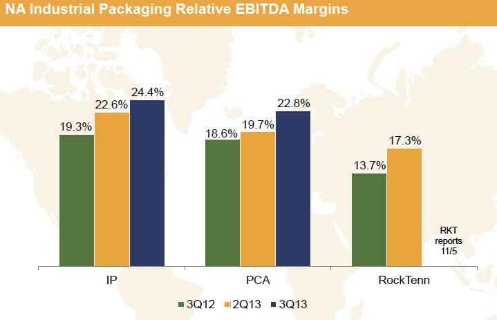 North American Industrial Packaging was a standout performer for International Paper during the third quarter. As shown in the above chart, the segment’s EBITDA margins easily eclipse peers and increased 510 basis points year-over-year to 24.4%. Although wood and fiber input costs were higher than anticipated and volume fell because of the inclusion of one less day during the quarter, the firm was able to realize strong gains in box and containerboard pricing to drive an improvement in earnings.