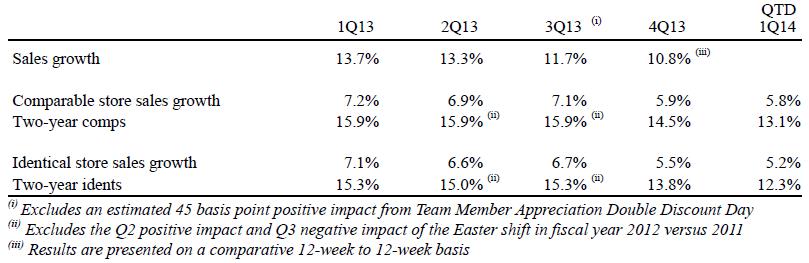 Natural and organic foods grocer Whole Foods (WFM) reported lower-than-expected fiscal fourth-quarter results Wednesday. Total sales advanced 2% from the 13-week period last year and 10.8% on a comparative 12-week basis, but comparable store sales growth of 5.9% during the quarter came in below our estimates. The firm’s ‘two-year comps’ trend (shown in table below) has slowed from the previous sequential three quarters, and it looks as though the slowdown has continued into the first quarter of fiscal 2014.