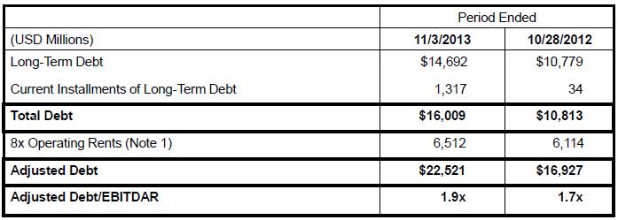 Through the nine months ended November 3, net cash provided by operating activities totaled $5.98 billion and capital expenditures were $964 million, resulting in free cash flow of about $5 billion, or 8.2% of sales. The firm held cash of $4.85 billion and current and long-term debt stood at $16 billion at the end of the firm’s fiscal third quarter. Despite the large debt load, however, adjusted debt to EBITDAR (earnings before interest, taxes, depreciation, amortization, and rent) is a very manageable 1.9 times.