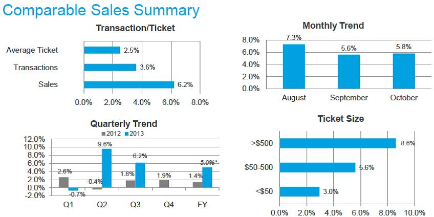 Based on year-to-date performance and outlook for the remainder of the year, the company raised its fiscal 2013 sales guidance and now expects sales to be up approximately 5.6 percent. Comparable store sales, on a 52-week like for like basis, are expected to be up approximately 7.0 percent for the year. The company raised its fiscal 2013 diluted earnings-per-share guidance and now expects diluted earnings per share to be up approximately 24.0 percent to $3.72 for the year (roughly in-line with our annual estimate).