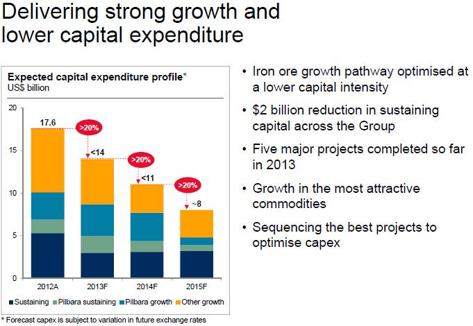 Rio Tinto (RIO) is also looking to scale back capital spending to bolster economic returns. Through 2015, the mining giant expects to cut spending by $3 billion each year (as revealed by this December 3 slide deck).