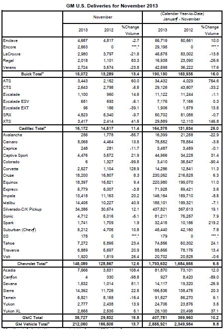 Chevrolet sales were up 13 percent and retail deliveries were up 20 percent. Sales of Chevrolet cars increased 19 percent, with Malibu up 41 percent, Volt up 26 percent, Impala up 20 percent and Camaro up 14 percent. Retail deliveries of the Cruze were up 39 percent and Impala more than doubled. The Chevrolet Cruze, Equinox and Volt had their best November sales ever. Sales of the Chevrolet Tahoe were up 23 percent, the Traverse was up 21 percent and the Silverado was up 12 percent. GMC sales were up 20 percent, with the Sierra up 22 percent and the Acadia crossover up 108 percent, which keeps it on track for its best year ever. Small business sales were up 38 percent, including a 76-percent increase in pickup deliveries. Commercial fleet deliveries increased 18 percent. Buick deliveries increased 13 percent and the brand is on track for its best year since 2005. November was Buick’s 19th consecutive month of year-over-year retail sales growth. Cadillac sales increased 11 percent and retail sales have grown in each of the past 18 months, driven by the success of the new XTS and ATS.