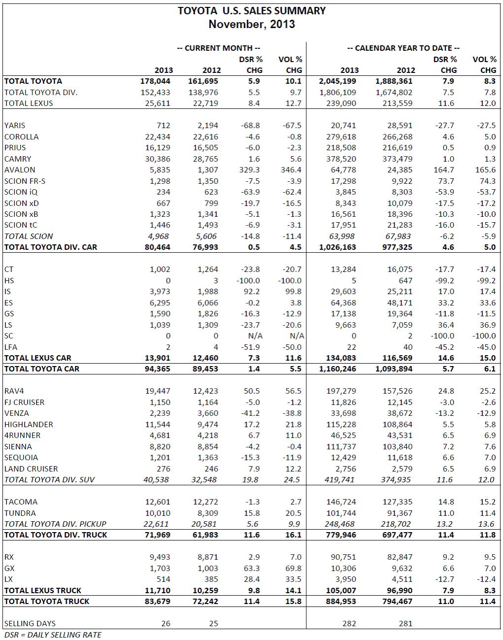Toyota’s (TM) November US auto sales, released Tuesday, also came in better than expected. On a raw-volume basis, unadjusted for 26 selling days in November 2013 versus 25 selling days in November 2012, sales advanced 10.1% from the year-ago month versus consensus expectations calling for a 6.5% gain. Total Toyota sales advanced 9.7% during the month while total Lexus sales jumped 12.7%. Camry sales jumped 5.6%, Corolla sales were flat, RAV4 sales leapt 56.5% and Tundra sales advanced 20.5%. The ‘Lexus IS’ model also performed well.