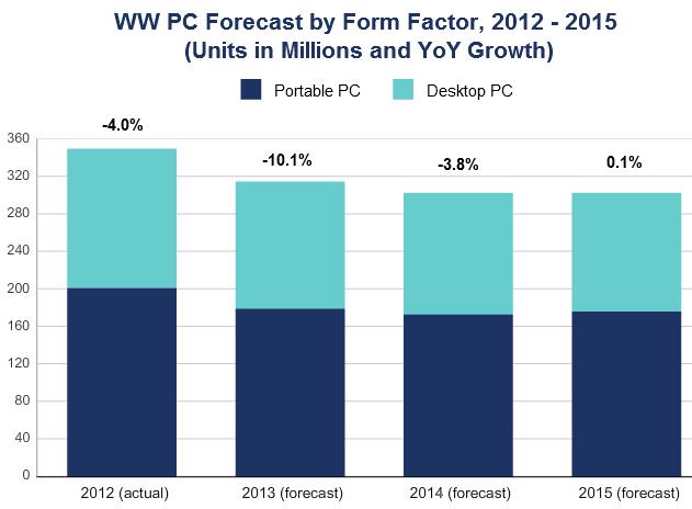 According to data released by the International Data Corporation (IDC) Worldwide Quarterly PC Tracker on December 2, personal computer (PC) shipments are now expected to drop more than 10% in 2013, slightly below the previous projection of -9.7%. Though 2013 will be the most severe yearly contraction on record, this news wasn’t the key takeaway. Instead, it was expectations for stabilizing demand by 2015 that provided a shot of optimism to the PC supply chain (see image below).
