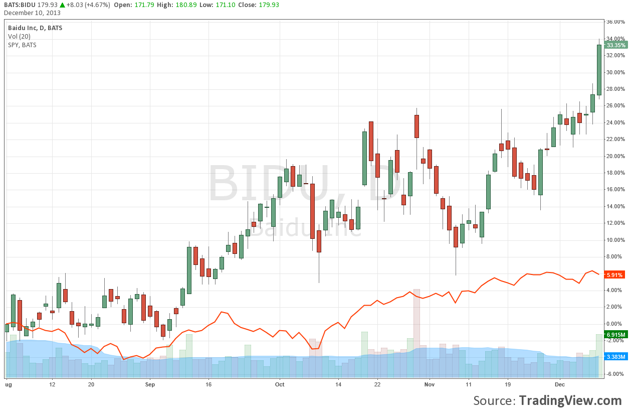 Shares of Baidu are up considerably since then, and for many members, the performance has been a nice early present for the holidays. Since the transaction alert email, shares of Baidu have jumped an impressive 33%+ versus 6% for the S&P 500. This is since August! A 20 share position would have resulted in a $927 gain in just a short period of time, many times the annual membership dues.