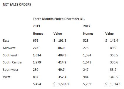On Tuesday, the US’ largest homebuilder, as measured by number of homes closed, revenue and pre-tax income, reported solid fiscal 2014 first-quarter results, lifting spirits across much of the industry. D.R. Horton’s (DHI) homebuilding revenue leapt 33% thanks primarily to a 19% increase in homes closed in the quarter and an average sales price increase of 10%, to $275,600. Home sales gross margin advanced 350 basis points, to 22.3%, helping drive a 76% increase in pre-tax income for the period. The company’s diluted earnings per share increased 80%, to $0.36. The pace of orders was also robust, jumping 14% in value to $1.5 billion and 4% in homes to 5,454. D.R. Horton’s sales order backlog also swelled 20% in value to $2.1 billion and 5% in homes to 7,684. We were quite pleased to see the reference to pricing power by Chairman Donald R. Horton: