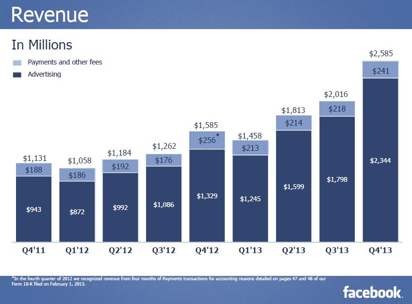 On January 29, Facebook (FB) kept the fundamental momentum going in its operations. The social media giant announced impressive fourth-quarter results, revealing that revenue jumped 63% (see image below) thanks to a 76% increase in revenue from advertising. Facebook indicated that mobile advertising revenue now represents more than half of advertising revenue compared to less than 25% in the same period a year ago. Income from operations nearly doubled in the period, to $1.13 billion, as the firm’s GAAP operating margin leapt 11 percentage points, to 44%. GAAP net income advanced to $523 million, compared to $64 million in the fourth quarter of 2012. Diluted earnings per share came in at $0.20 per share in the quarter, up from $0.03 in the prior-year quarter. For all of 2013, net cash from operations totaled $4.22 billion and capital expenditures were $1.36 billion, resulting in free cash flow of $2.86 billion (or 36.3% of revenue). The company’s free cash flow conversion is among the best in the market today. At the end of 2013, cash and marketable securities stood at $11.45 billion.