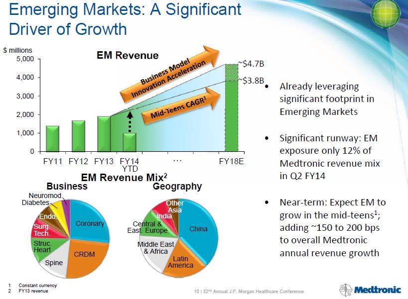 Medtronic’s fiscal third-quarter results were as expected, with worldwide third-quarter revenue jumping 4% on a constant-currency basis. Non-GAAP earnings faced some modest pressure as a result of a difficult comparison due to the US R&D tax credit in the year-ago period and a charge related to the HTN-3 trial not meeting its primary efficacy endpoint. Emerging market revenue advanced 12% on a constant-currency basis during the quarter. Management’s outlook for 2014 was encouraging, however: