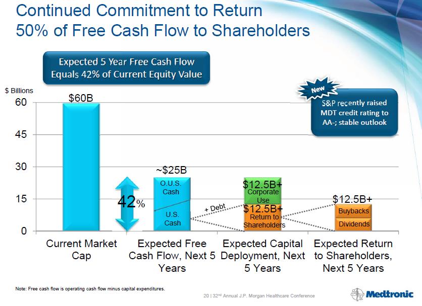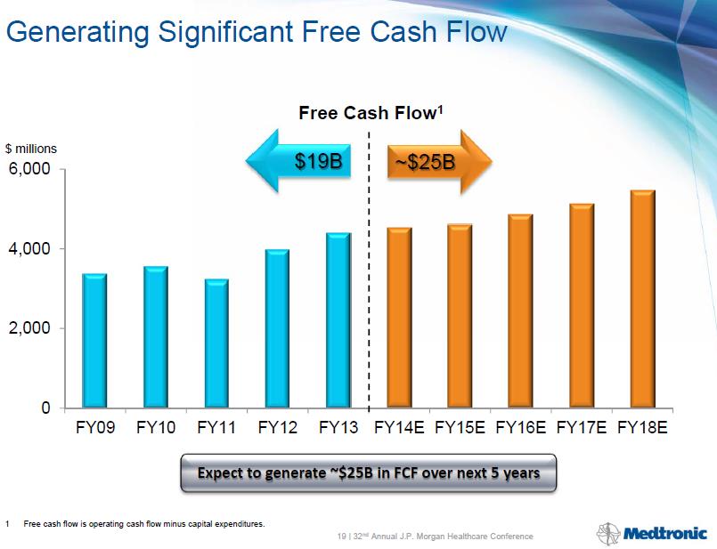 A strong credit rating and balance sheet coupled with the willingness to enter risk-sharing models reveals a level of financial strength that will pave the way for future dividend increases. Medtronic’s free cash flow generating capacity is undeniable (see images below) and represents the primary reason why the company has such a high score on the Valuentum Dividend Cushion methodology. The Valuentum Dividend Cushion adds the firm’s net cash position on the balance sheet (cash less debt) to its future expected free cash flow (cash from operations less capital spending) over the next five years. The measure then takes that sum and divides it by expected future cash dividend payments in the next five years to arrive at a free-cash-flow based dividend coverage measure that also considers the strength of the balance sheet. The methodology has performed very well (see here). Medtronic’s score on the Valuentum Dividend Cushion is 2.5 at the time of this writing. Future dividend increases should be expected.