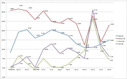 Also topping the news was ChannelAdvisor data. The report, released Thursday, indicated that Amazon’s same-store sales growth in February came in at 23% compared to January’s 14% increase, a significant sequential ramp, while eBay’s (EBAY) February same-store sales growth came in at 15%, up from a 12.7% increase in January. ChannelAdvisor noted that the increases were caused by the winter snow storms subsiding and delivery times returning back to normal. Amazon continues to expand at a greater pace, but eBay’s growth (blue line) is much more consistent (as shown below):