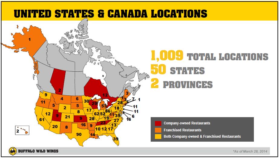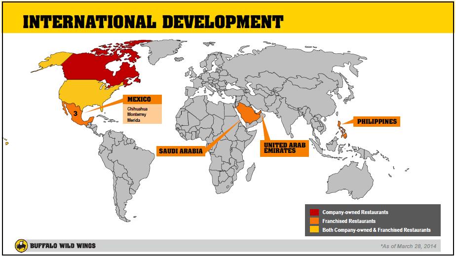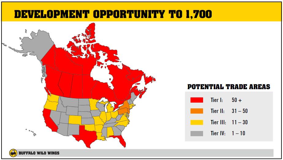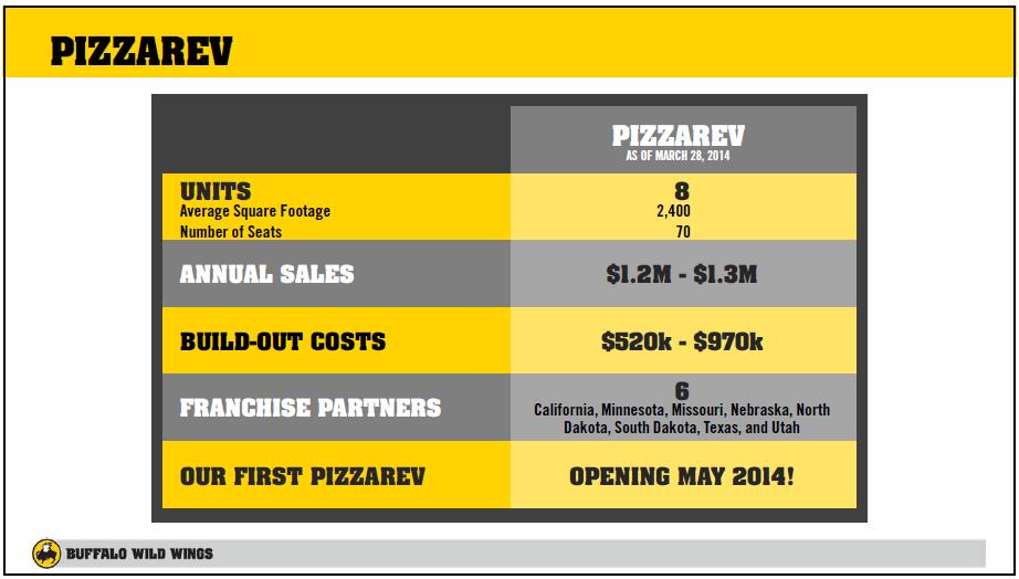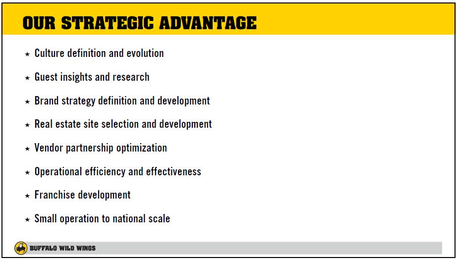 Substantial unit growth opportunities remain across the US and Canada. The company’s vision is to be a growth enterprise of restaurant brands, with more than 3,000 restaurants worldwide. The firm’s growth strategy includes creating the ultimate guest experience in the US and Canada, growing Buffalo Wild Wings into an international, globally-connected brand, and building an enduring, diversified portfolio of brands, including PizzaRev. (2)