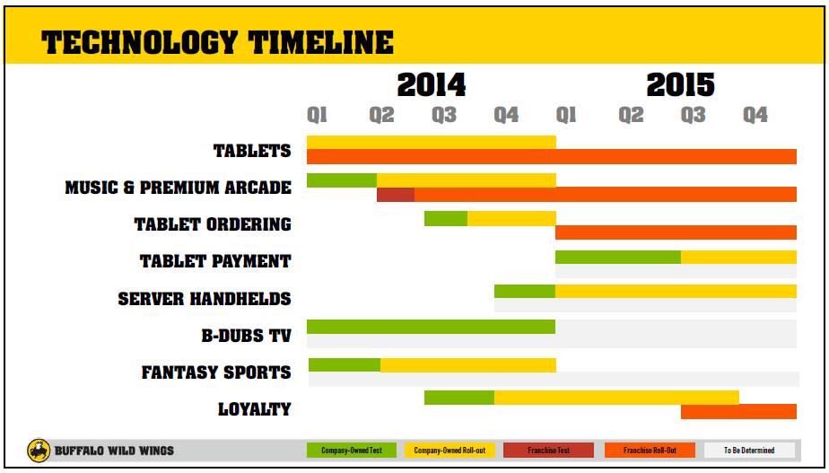 Buffalo Wild Wings continues to invest in technology to improve the guest experience and attract new demographics: tablets, music & premium arcade, tablet ordering and payment, server handhelds, B-Dubs TV, fantasy sports, loyalty. (5)