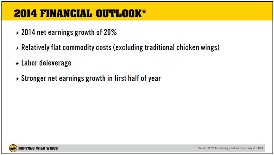 2014 financial outlook: 2014 net earnings growth of 20%; relatively flat commodity costs (excluding traditional chicken wings); labor deleveraging, strong net earnings growth in first half of 2014. (4)