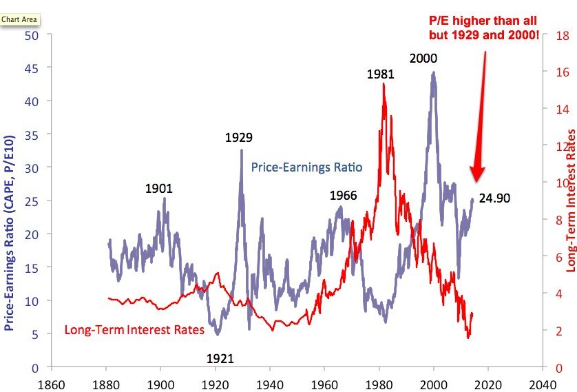 1) The cyclically-adjusted price-to-earnings ratio of the S&P 500 (SPY) is higher than at any point in the 20th century with the exception of the peaks of 1929 (right before the market crashed) and 2000 (right before the market crashed).