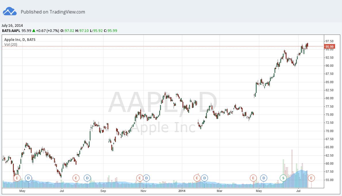 …and now that we’ve let our emotions show. How can we forget about Apple (AAPL)?!?! The iPhone maker is approaching $100 per share, the split-adjusted equivalent of $700 following its 7:1 stock split. The strong price performance is in part a result of Apple’s new arrangement (2) with IBM (IBM). Apple’s market cap is now approaching $600 billion, and it yields north of 2%!
