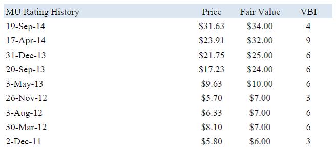 Example 1: If you pull up a 16-page report and, let’s say, it is dated from late April, and the company had registered a 9 on the index and shares were trading $24 at the time. If the stock is now in the mid-$30s, your response should be: “Wow, the stock registered a 9 and now has advanced significantly. The methodology really highlighted this one.” Your response should not be that the report is dated from April. Micron Tech (MU).