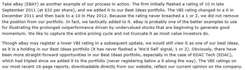 Example 3: Today, eBay (EBAY) has decided to split its business into two standalone publicly-traded businesses in a tax-free spin-off in the second half of 2015. Shares are up ~7% at the time of this writing, approaching all-time highs. We use eBay as the prime example of how we use the Valuentum Buying Index. See here >> This is good.