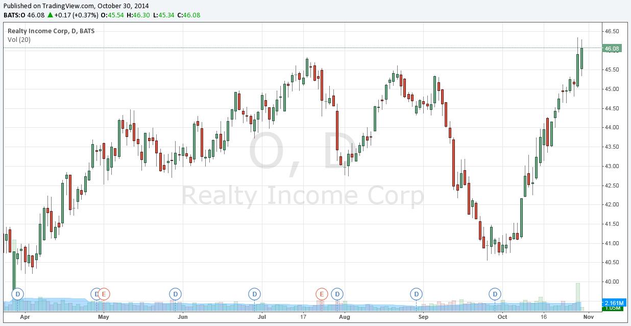 One of the most important duties of our team is to keep bad ideas from creeping into your portfolio–bad ideas like American Realty Capital (ARCP). Accounting issues at American Realty Capital have recently cost its stockholders dearly, with the REIT’s shares down 30% from the announcement. Only after the fact did brokerage houses JP Morgan, BMO Capital and Capital One downgrade the REIT’s shares. Even some of the most-read REIT authors on blogs had bought into ARCP’s hype. Not us. Realty Income (O)—nicknamed the Monthly Dividend Company–remains our standout dividend growth REIT pick, and investors have flocked to its shares amid the chaos. Realty Income’s shares are now breaking out thanks to an excellent October run, as shown below.