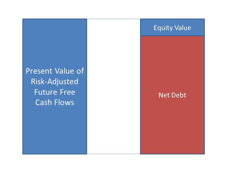 In investing, the “capital stack” represents the firm’s capital structure, beginning with net debt at the bottom and moving up to equity at the top. In order for any firm to have any equity value, the present value of its risk-adjusted future free cash flows must sum to a value greater than its net debt. The hypothetical firm shown below in the image has equity value because the present value of its risk-adjusted future free cash flows is greater than the sum of its net debt.